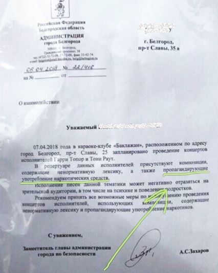 В последнее время запретов в русском рэпе становится всё больше. Вчера, например, Гарри Топор опубликовал в инстаграме историю о том, как мэрия Белгорода решила запретить его с Тони Раутом концерт. Причину обозначили стандартную для всех рэперов — пропаганда наркотиков. Песен Топора и Раута власть имущие слушать не стали, ведт проще просто запретить, а потом разбираться.