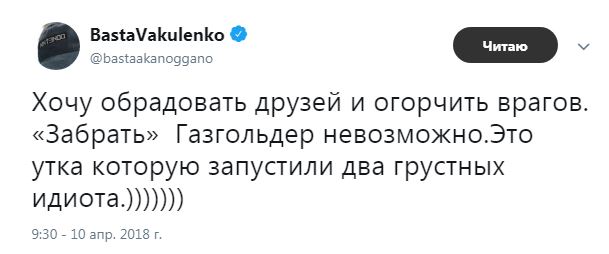 Сегодня Баста коротко, но исчерпывающее прокомментировал эту информацию в твиттере: