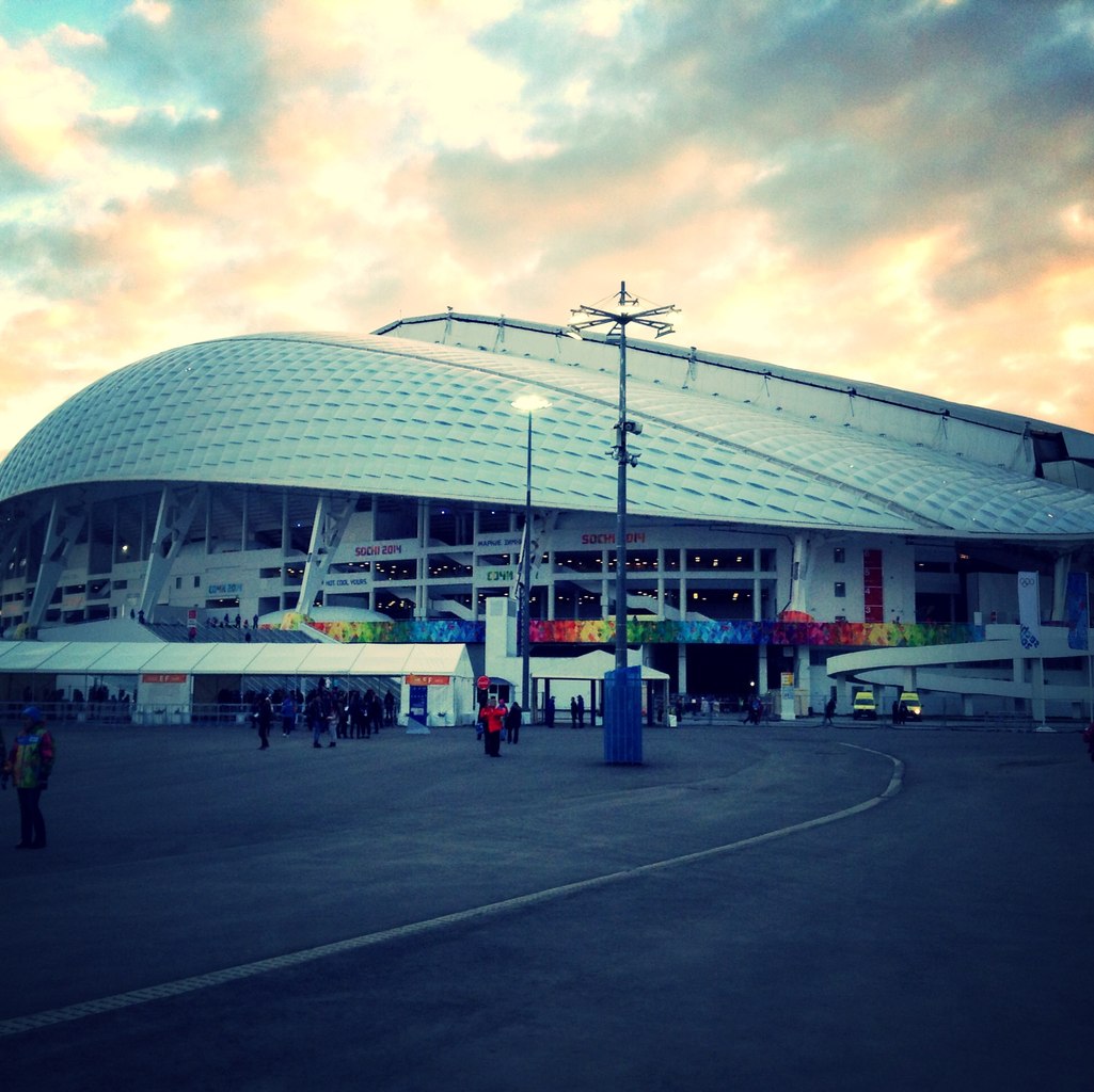 Олимпийский парк (это там где стадионы и развлечения — внизу, у моря) поражает своими масштабами. Огромная территория, покрытая павильонами и стадионами, длинными рядами точек общественного питания и огромными дисплеями. Выстроенный парк развлечений еще не открыт, но уже манит изгибами и петлями американских горок. Опять же, всюду улыбчивые волонтеры — они радостно приветствуют, спрашивают как дела, легко заводят разговор, подбадривают, веселят и направляют гостей парка. "Вам на Фишт? На репетицию церемонии? Тогда вам через желтый мост!". Впереди пять мостов олимпийских цветов, и каждый ведет к разным объектам.