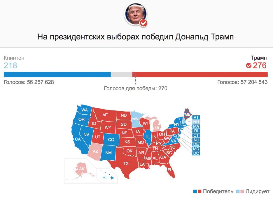 Итак, 45-м президентом США, вопреки всем прогнозам, стал Дональд Трамп – даже Хиллари Клинтон уже успела признать своё поражение. Окончательно о победе республиканца стало понятно после подсчета голосов в штате Висконсин – считая этот штат, Трамп набрал более 270 голосов выборщиков, которые нужны для победы.
