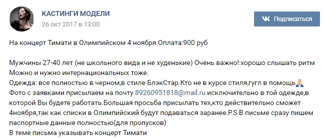 «Битва за Олимпийский». Именно так и никак иначе будет называться период взаимоотношений Оксимирона и Тимати, который мы сейчас наблюдаем. Но обо всём по порядку. Для начала восстановим хронологию событий последних недель. 26 октября в группе ВКонтакте под названием «Кастинг моделей» появилось объявление о наборе массовки на концерт Тимати 4 ноября в «Олимпийском». Постановочным зрителям обещали заплатить по 900 рублей.