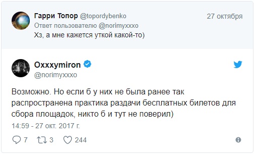 Окси не стал комментировать предложение Тимати. Вместо этого он записал видео, в котором отрапортовал о солд-ауте на своём концерте в «Олимпийском» 6 ноября, а также о старте продаж дополнительных двух тысяч билетов.