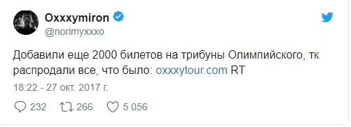 Этой весной Тимати назначил свой второй концерт в «Олимпийском» на 4 ноября. Разница в два дня естественным образом ещё тогда вызвала удивление, породив массу разговоров о том, зачем этого было сделано, и кто же из них соберёт больше. В итоге оба примерно за неделю объявили о солд-ауте. У Тимати изначально было открыто 25 тысяч, у Окси – 18, но Мирон принялся добавлять билеты – вечером 2 ноября он писал, что речь идёт уже о 22 тысячах проданных билетов.