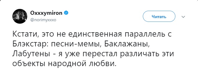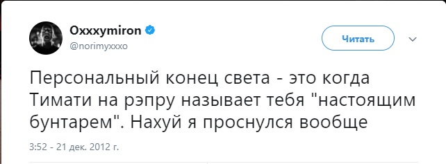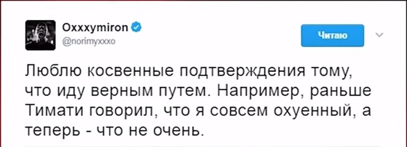 И это только то, что касается переписки музыкантов за несколько дней до своих концертов. Но ещё задолго до этого артисты упоминали друг друга в интервью и постах в социальных сетях. 21 декабря 2012 года Тимати в ходе блиц-опроса RAP.RUназвал Окси «настоящим бунтарём, интеллектуалом и циником». Чему последний посвятил свой твит: