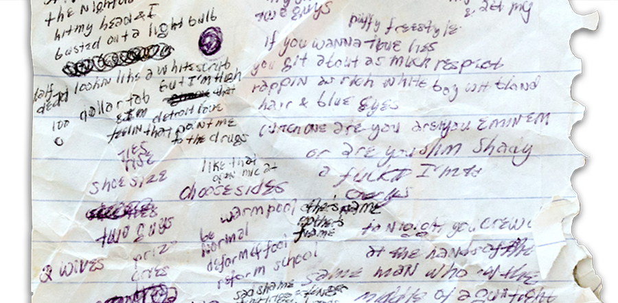 Во время студийных сессий многие обнаружили, что Маршалл записывает тексты по кругу, постоянно рифмуя друг с другом не только окончания строк, но и слова внутри предложений и даже отдельные слоги. Таких блокнотов у него были десятки, если не сотни, а окружающих он воспринимал как ходячие словари.