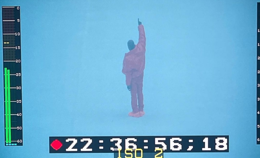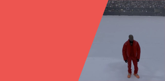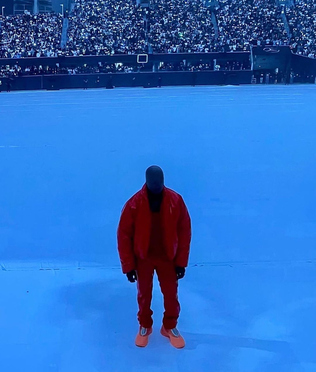 Канье Уэст появился перед публикой в одиночестве — вокруг него было огромное пустое поле. Сам рэпер был одет в красную куртку из своей коллекции с GAP, а на ногах у него были еще не выпущенные YEEZY 1020. Лицо рэпера, разумеется, было скрыто за маской.