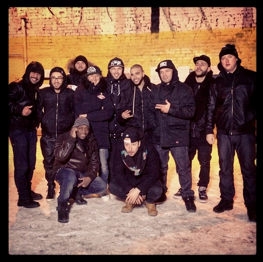 В инстаграме ST появилось такое вот фото — предположительно со съемок клипа Тимати. Кроме артистов Black Star и самого Александра там появилась группа Легальный Бизне$$ и Джи Вилкс из Big Black Boots.