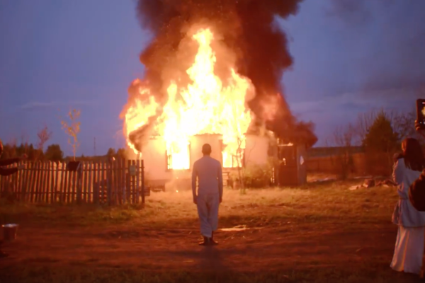 На экране пожар — благообразные сельские жители выносят из огня кур и стоически наблюдает за тем, как храм их ежедневной жизни превращается в пепел.